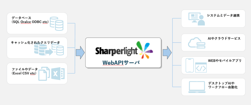Sharperlight WebAPIサーバーは、データベースやファイルデータといった様々な情報源を統合し、必要な形式で各システムへ安全に提供します。